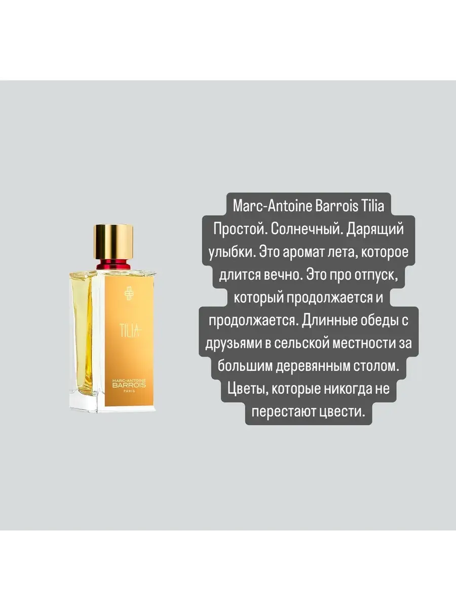 Marc-Antoine Barrois Tilia — удивительный по своей красоте и пронзительности цветочно-древесный унисекс-парфюм, пополнивший в 2024 году ароматическую коллекцию бренда Marc-Antoine Barrois. Аромат посвящен лету. Простой. Солнечный. Вызывающий улыбку. Это аромат бесконечного лета, того самого восхитительного ощущения, когда кажется, что счастье будет длиться вечно. А Tilia — это имя воображаемой звезды, которая сияет в счастливые дни.